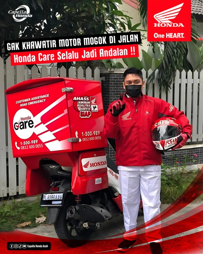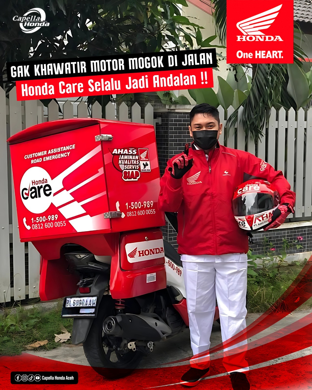 Jadi, buat kamu-kamu yang punya masalah terkait sepeda motor anda, misalnya motornya tiba-tiba mogok, mesin tidak mau nyala, kunci kontak hilang, dll (kecuali abis bensin dan ban bocor ya guys) maka jangan sungkan untuk menghubungi nomor Hotline Number kami di 1-500-989, 0812-6000-055 atau no telepon Dealer yang ada di Banda Aceh ya. Motor mogok ya Honda Care solusinya. Honda Care selalu ada untuk Anda. Pakai Honda no worry worry lagi deh.