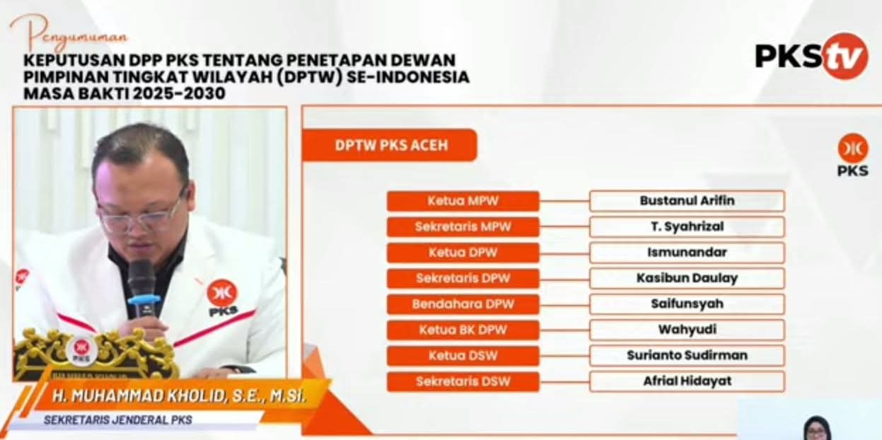 DPP PKS mengumumkan susunan kepengurusan Dewan Pimpinan Tingkat Wilayah (DPTW) PKS Aceh periode 2025-2030, Kamis (24/07/2025) sore.