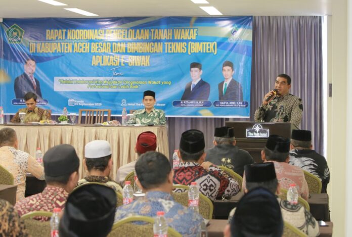 Kantor Kementerian Agama Kabupaten Aceh Besar melalui Penyelenggara Zakat dan Wakaf menggelar Rapat Koordinasi Pengelolaan Tanah Wakaf serta Bimbingan Teknis Aplikasi E-Siwak, yang berlangsung di Hotel The Padee, Aceh Besar, pada Kamis (25/9/2025).