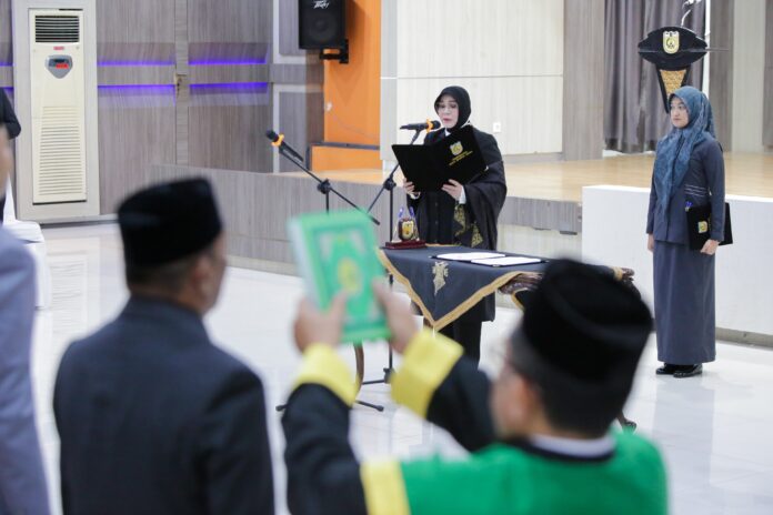 Wali Kota Banda Aceh Illiza Sa’aduddin Djamal melantik dan mengambil sumpah jabatan 17 pejabat tinggi pratama di lingkungan Pemko Banda Aceh, Senin, 6 Oktober 2025.