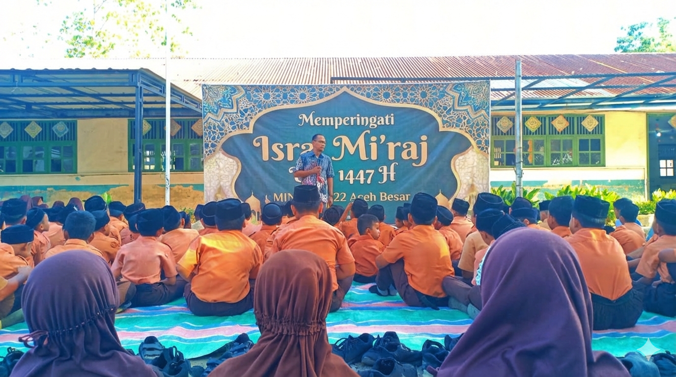 Madrasah Ibtidaiyah Negeri (MIN) 22 Aceh Besar menggelar kegiatan peringatan Isra’ Mi’raj Nabi Muhammad SAW 1447 Hijriah di halaman madrasah tersebut, Sabtu (17/1/2026).