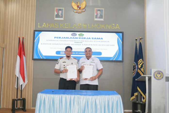 Perjanjian kerjasama diteken langsung Kepala Kantor Kemenag Aceh Besar H Saifuddin SE dan Kepala Lapas Kelas III Lhoknga Husni SH MH di Lapas Lhoknga, Aceh Besar, Selasa (27/1/2026). Turut hadir Kasi Bimas Islam H Khalid Wardana SAg MSi, jajaran KUA dan penyuluh agama Islam.